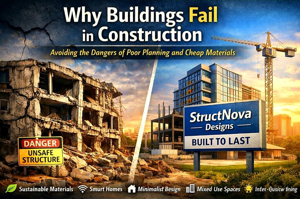 Building failures aren’t accidents they’re consequences of neglect. StructNova Designs ensures every project is backed by detailed drawings, sustainable materials, and expert oversight, protecting clients from costly mistakes.